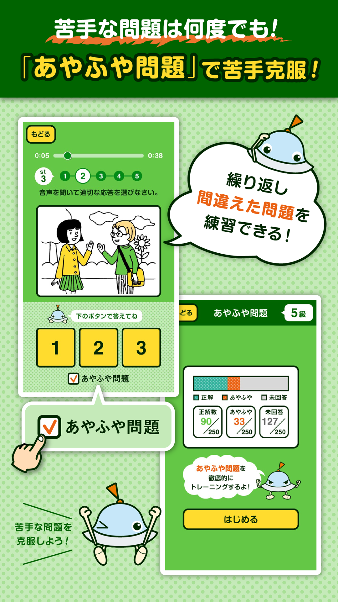 「ステージモード」などで間違えた問題や自信の無かった問題を繰り返し解くことで苦手を克服できます。