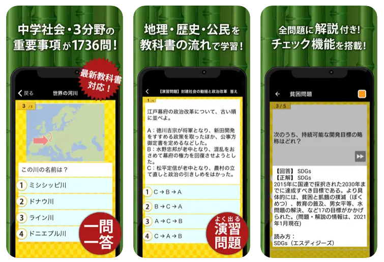 アプリ『中学社会 地理・歴史・公民』は、中学生の社会の範囲を網羅した一問一答型の問題集アプリです。